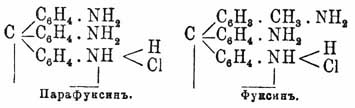 Фуксин C20H19NH3.HCl. Эта чудная кармуазиново-красная краска, служащая также исходным материалом для получения других анилиновых К., — хлористоводородная соль особого органического основания — розанилина C 20H21N3 O. Розанилин образуется при окислении смеси, состоящей из равного числа частиц анилина, ортотолуидина и паратолуидина, т. е. анилинового масла для красных К., по уравнению: