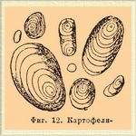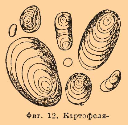 Отсюда видно, что наименьшие размеры имеют крахмальные зернышки ячменя, большие — в пшенице и наибольшие — во ржи. Из приведенных фигур видно, что крахмальные зернышки представляют или однообразное строение, или слоистое, а также замечается и внутренняя полость или ядро; которое чаще всего определяется местом, откуда идут расходящиеся к окружности трещины в виде лучей; слоистость и трещины, согласно гипотезе Негели, должны быть приписаны неодинаковому распределению воды в различных частях крахмального зерна. Крахмальные зернышки овса (фиг. 4) представляются в виде простых и сложных зерен, последние имеют шарообразную или яйцевидную форму, составленную из многогранных крупинок, диаметр которых чаще бывает около 0,008 мм.; диаметр сложных зерен бывает от 0,014 до 0,054 мм. и чаще 0,031 мм.; более многочисленные сложные зернышки имеют округленную или бочкообразную форму, образованную 2-4 правильно сложившимися крупинками. Крахмальные зернышки риса (фиг. 5) имеют сходство с предыдущими; сложные зерна бывают от 0,018 до 0,036 и чаще 0,022 мм.; отдельные крупинки, чаще около 0,005 мм., имеют довольно правильную многогранную форму, внутри крупинок замечаются звездообразные полости. Крахмальные крупинки маиса (фиг. 6), ближе лежащие к поверхности зерна, имеют многогранную форму, лежащие же ближе к центру более округлены, яйцевидны или многогранны, с закругленными гранями; чаще встречающийся диаметр отдельных зернышек около 0,020 мм.; внутри их видна полость с звездообразными расщелинами. Крахмальные зерна гречихи (фиг. 7) представляются многогранниками с плоскими или округленными гранями; диаметр зерен от 0,0132 до 0,0220 мм.; внутри их замечаются центрально расположенные округленные полости; в микроскопической картине отдельные зернышки представляются или раздельными, или соединенными в группы, состоящие из двух или большого числа зернышек. Крахмальные зерна проса (фиг. 8) имеют вид мелких многогранников, диаметром от 0,0044 до 0,0088 мм.; слоистость и полости незаметны в них. Существенно отличаются от вышерассмотренных форм крахмальные зернышки растений бобовых, напр. бобов (Vicia Faba) и фасоли (Phaseolus vulgaris, фиг. 9), гороха (фиг. 10) и чечевицы (фиг. 11); крахмальные зернышки картофеля (Solanum tuberosum, фиг. 12) столь же трудно смешать под микроскопом с формами, свойственными крахмальн. зернышкам других растений.