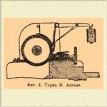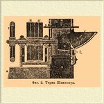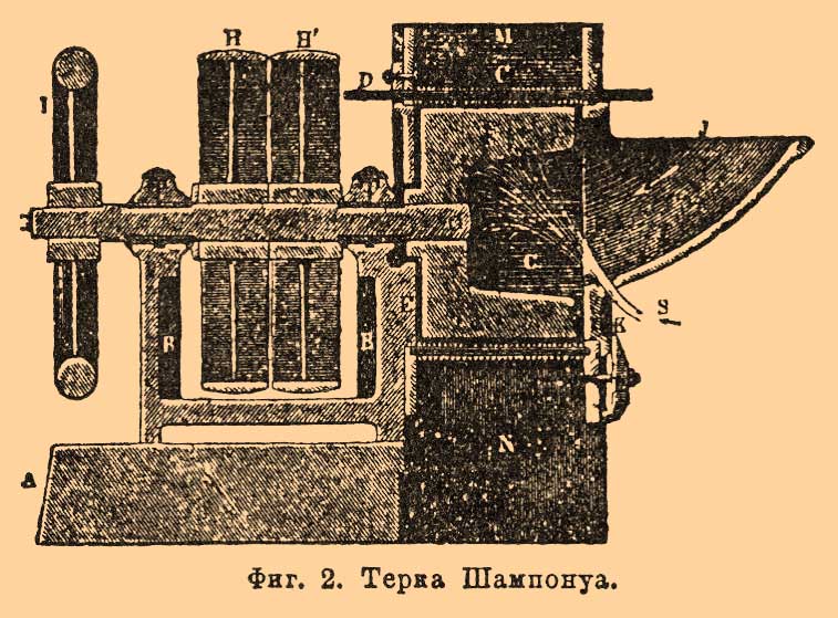 Терочный барабан состоит обыкновенно из двух чугунных шайб, отлитых вместе со сквозной осью, которой барабан насаживается на железный вал со шкивами. В каждой шайбе сделана выемка, в которую вставляются концы стальных пил и прокладываемых между последними деревянных или железных пластин. Пилы представляют стальные пластины, на которых нарезываются зубцы с двух сторон для того, чтобы по изнашивании одной стороны можно было повернуть пилу на другую сторону. Для правильного действия терки необходимо, чтобы зубцы пил выступали над поверхностью барабана, однако, не более как на 1 мм.; затем вышеупомянутый деревянный брусок (Reibklotz) должен иметь высоту в 8-10 см. и быть установлен так, чтобы ось барабана лежала на продолжении верхней поверхности этого бруска. Чем более диаметр терочного барабана, тем тоньше получаемая мезга. Количество размельчаемого теркой картофеля зависит от величины терочной поверхности, т. е. от диаметра и от длины терочного барабана. При диаметре барабана в 0,4 м. (терки для малых и средних заводов) терка перерабатывает на 1 см. длины барабана (или вернее длины пилы) 1 цнтн. картофеля в час, следовательно, при длине барабана в 25 см.-25 центнер. в час, причем скорость вращения барабана в таких терках от 800 до 900 оборотов в минуту. Терки того же типа, но других конструкторов, разнятся некоторыми деталями устройства. Напр., в некоторых терках картофель подводятся к терочному барабану по желобу и нажимается к поверхности барабана особыми поршнями, называемыми пуссуарами. На кустарных заводах употребляют терки с барабанами, обитыми железными листами с пробитыми отверстиями, как это делается на обыкновенной кухонной терке. Терка Шампонуа, изображенная на фиг. 2, существенно отличается от обыкновенных терок прежде всего тем, что работающая поверхность неподвижна.