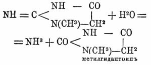 Креатинин (физиол.) находится в моче и обыкновенно добывается из нее по способу Нейбауэра (см. химическую статью). К. получается и путем обработки креатина. К. получен и синтетически, путем нагревания углекислого гуанидина с саркозином (Горбачевский). При действии баритовой воды и при температуре в 100° Ц. К. разлагается на метил-гидантоин и аммиак. К. — продукт дезассимиляции или обратного метаморфоза белковых веществ клеточной протоплазмы или пищи; согласно с этим, вещество это можно находить и в мышцах, и в крови, и в амниотической жидкости плода и т. д., но в качестве продукта подлежащего выделению К. преимущественно находится в моче. В мясном бульоне он встречается всегда в небольших количествах. В теле при обычных условиях жизни, К. всегда происходит из креатина (см.). В сутки человек выделяет около 1,12 гр. К. Количество это увеличивается при мясной диете и падает при растительной. К. едва ли превращается в организме в мочевину, а выделяется как таковой.