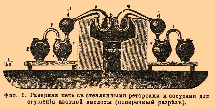 При добывании азотной кислоты на заводах применяют исключительно чилийскую селитру, которая, примерно, вдвое дешевле калиевой и, сверх того, вследствие меньшого атомного веса натрия (Na 23, K 39), в равном весе содержит больше азотной кислоты, а, следовательно, дает и больший (почти на 20%) ее выход. Относительную пропорцию серной кислоты берут или по уравн. (1), или по ур. (2). Так как получаемая, в качестве побочного продукта, кислая сернонатриевая соль (бисульфат) без предварительной переработки на среднюю соль (см. Сульфат), помимо содовых заводов (см. Сода), сбыта почти не имеет и либо продается за бесценок, либо зачастую и просто выбрасывается, то было бы выгоднее работать согласно ур. (2), расходуя, примерно, вдвое меньшее количество серной кислоты; но, ввиду того, что в этом случае, благодаря высокой температуре реакции, азотная кислота, отчасти разлагаясь, не только получается с большим содержанием низших окислов азота [Это, впрочем, не всегда имеет значение, а иногда даже и желательно, если имеют в виду получение красной дымящей азотной кислоты (см. далее).], которые, кроме того, по своей летучести являются источником значительных потерь в производстве, но и оказывается в общем более слабой [Ибо рядом с крепкой кислотой здесь получается много слабой при уловлении водой низших окислов (см. ниже).], чем при работе по уравн. (1); затем, ввиду того, что получаемый в остатке по уравн. (2) средний сульфат весьма тугоплавок и его, при удалении, приходится выламывать из реторт, затрачивая на это немало времени и труда, тогда как бисульфат, получаемый по уравн. (1), легкоплавок и может быть с большим удобством выпущен в жидком виде — обыкновенно предпочитают добывать азотную кислоту при употреблении избытка серной, особенно, когда стремятся получить ее возможно более свободной от низших окислов азота и в то же время крепкой, как это, напр., требуется для пироксилинового и нитроглицеринового производств. Строго говоря, на практике ни в том, ни в другом случае не придерживаются в точности отношений, требуемых уравнениями (1) и (2), а обыкновенно в одном случае берут на 2NaNO 3 около 1 1/4 Н 2 SО 4 или на 100 в. ч. обыкновенной 96% чилийской селитры 70-75 в. ч. крепкой серной кислоты (купоросного масла) с содержанием 95% моногидрата или в 66° В, а в другом на 2NaNO 3 около 1 3/4 H2SO4 или приблизительно равные количества селитры и серной кислоты. Очень часто для получения слабой азотной кислоты употребляют менее крепкую, а потому и более дешевую серную кислоту в 60-62° В, содержащую от 78 до 82% моногидрата и получаемую сгущением в свинцовых ваннах (см. Купоросное масло), причем на 100 в. ч. чилийской селитры считают от 100 до 110 в. ч. такой кислоты, что приблизительно составляет на 2NaNО 3 около 1 1/2 H2SO4. Представляя преимущество дешевизны, 60 градусная кислота однако сильнее разъедает чугунные сосуды, в которых обыкновенно производится разложение селитры, и требует большего их объема, большего количества топлива и больше времени для перегонки, вследствие чего многие авторитетные заводчики (напр., О. Гутманн в Англии) предпочитают и для приготовления слабой азотной кислоты получать сперва крепкую на крепкой серной кислоте и затем разбавлять ее водой до любой желаемой концентрации. Самая операция разложения селитры прежде производилась в больших стеклянных ретортах, которые размещались в два ряда в соот