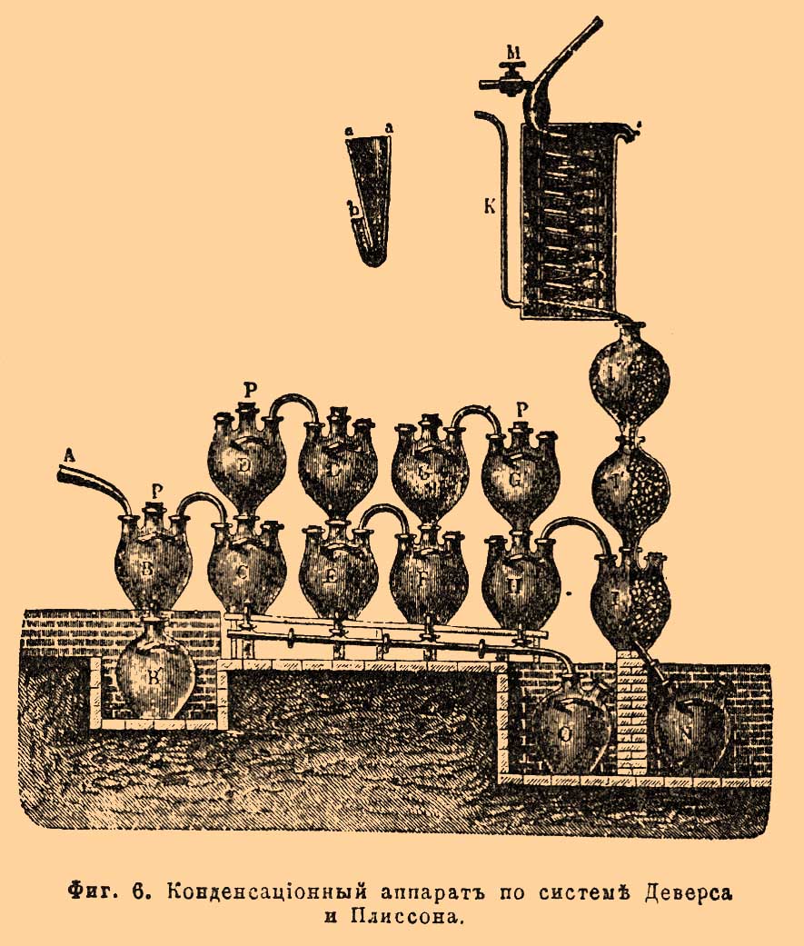 Сгущение паров азотной кислоты чаще всего производится в трехгорлых бутылях (фиг. 4 ЕЕ) или таких же баллонах или бомбонах (bombonnes, tourilles, фиг. 2 е g и фиг. 3 BB) из особой кислотоупорной глины с кранами внизу для выпуска кислоты, соединенных с ретортой большей частью стеклянным форштоссом, а между собой дугообразными глиняными трубами [Соединение производится с помощью эластичной замазки, хорошо противостоящей действию кислот и приготовляемой из тонкого порошка тяжелого шпата на растворе каучука (500 ч .) в льняном масле (2500 ч.) с примесью серы (3 ч.). Другая превосходная, быстро твердеющая в тепле замазка, приготовляется из асбестового порошка в смеси с силикатом натрия.]. Число баллонов изменяется от 7-9 при малых до 16-24 при больших ретортах. Два ряда баллонов от двух реторт обыкновенно замыкаются в конце одной общей глиняной башенкой, наполняемой коксом пли кусками пемзы и орошаемой сверху водой для удержания последних следов азотной кислоты, не успевших сгуститься в баллонах, а главным образом для поглощения NO 2, превращающейся с водой и кислородом воздуха в слабую азотную кислоту, которая и вытекает из башни в подставленный внизу сосуд. Сгущающаяся в баллонах кислота неодинакова по крепости и по чистоте. В первом баллоне она всегда содержит довольно много серной кислоты и сульфата, механически увлекаемых из реторты парами и газами, а также и просто вследствие нередко случающегося перебрасывания содержимого реторты; эту кислоту выливают обыкновенно обратно в реторту. В следующих баллонах получается наиболее чистая и менее всего окрашенная низшими окислами кислота, далее же она содержит хлор, развивающийся на счет примеси к селитре поваренной соли, и в изобилии низшие окислы азота. Иногда при получении слабой азотной кислоты в 36° В, для лучшего сгущения в баллоны наливают немного воды для той кислоты, которая вытекает из башни. Фиг. 6 представляет ныне нередко употребляемый конденсационный аппарат Деверса и Плиссона.