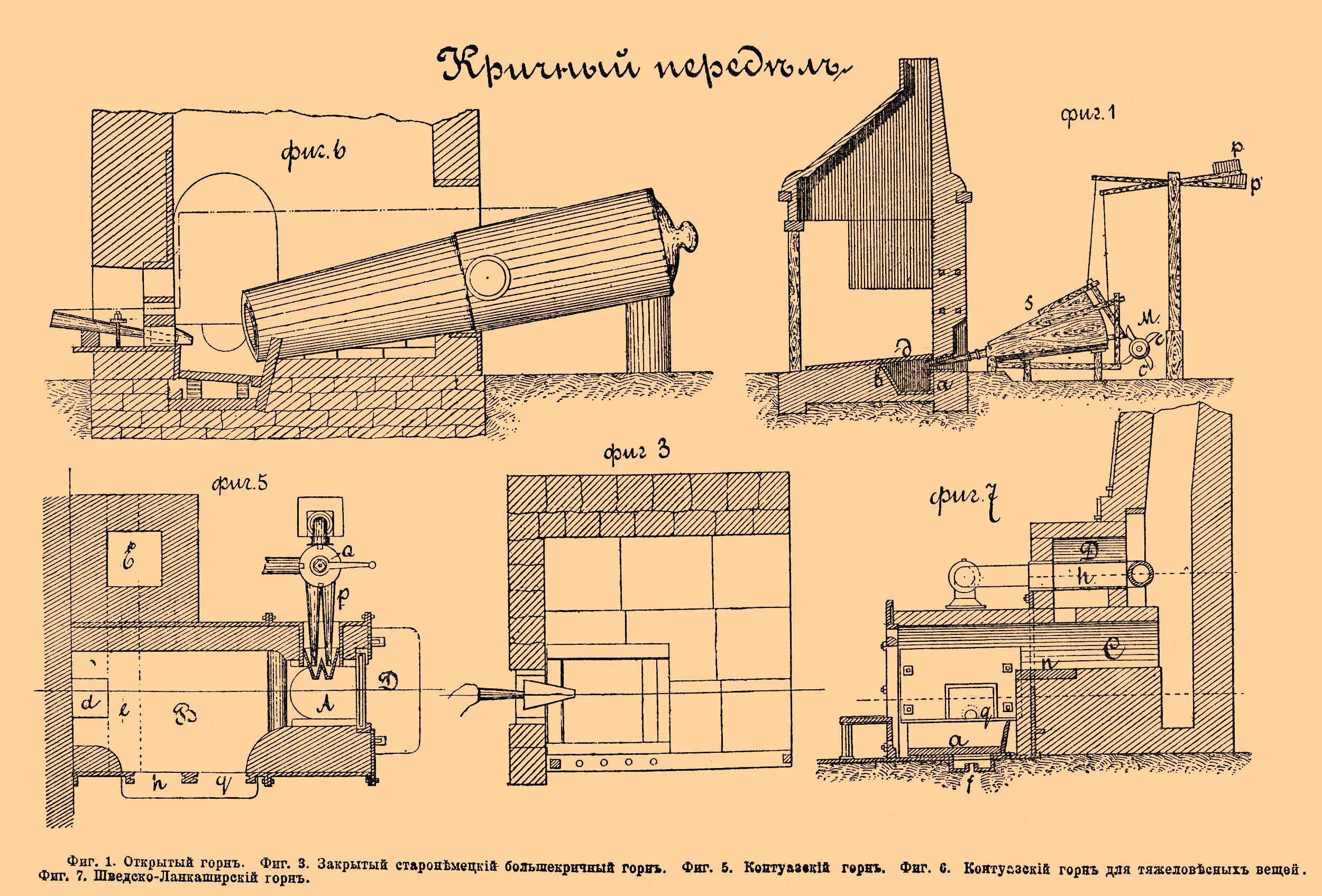 Фиг. 1. Открытый горн. Фиг. 3. Закрытый старонемецкий большекричный горн. Фиг. 5. Контуазский горн. Фиг. 6. Контуазский горн для тяжеловесных вещей. Фиг. 7. Шведско-Ланкаширский горн.