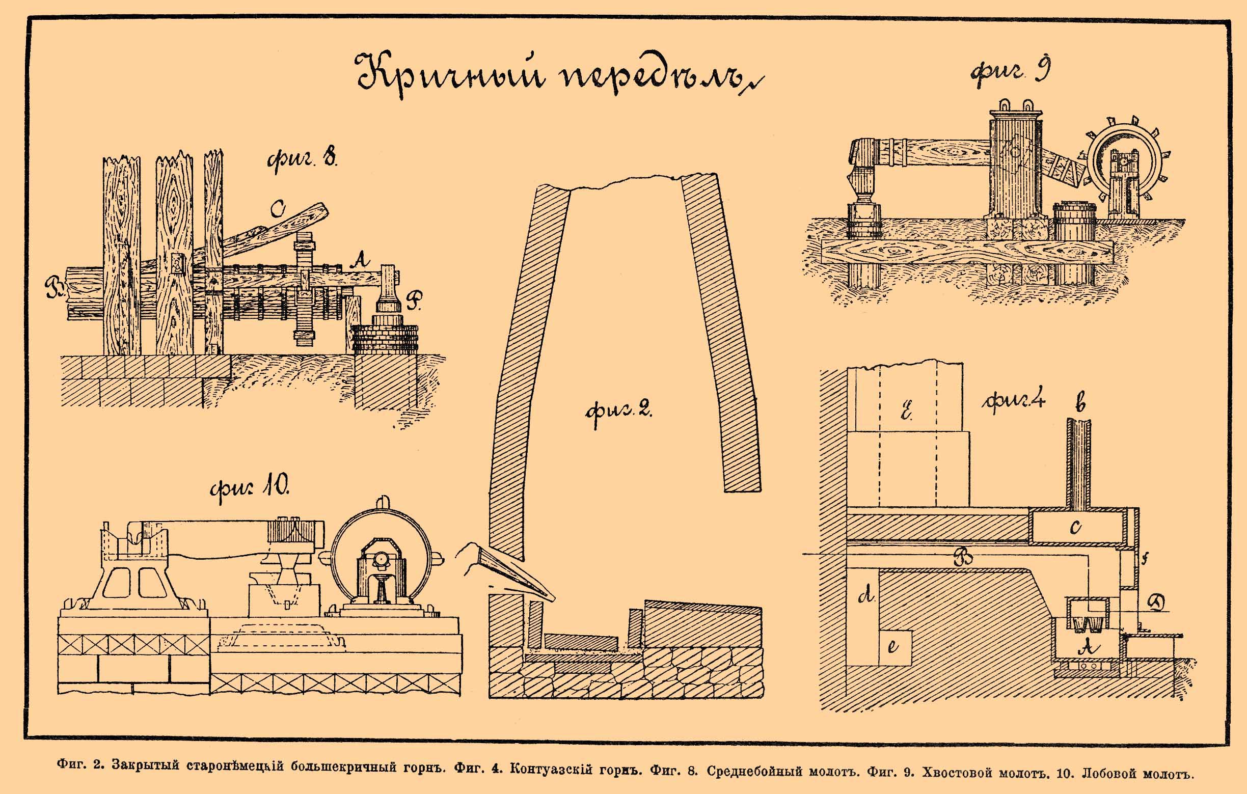 Фиг. 2. Закрытый старонемецкий большекричный горн. Фиг. 4. Контуазский горн. Фиг. 8. Среднебойный молот. Фиг. 9. Хвостовой молот. 10. Лобовой молот.