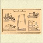 Фиг. 1 представляет самый простой вид открытого К. горна. Прямоугольное углубление, в виде ящика, ограничено чугунными досками: доска а, имеющая наклон вовнутрь горна и над которой помещается фурма, назыв. подфурменной; противоположная доска b, с наклоном в обратную сторону — противофурменной; из боковых досок одна наз. (с) соковой или передней, с отверстием для выпуска шлаков, другая (d), имеющая наклон из горна — задней или хвостовой. Плита, лежащая на дне горна, назыв. донной доской; она имеет уклон к соковой и к противофурменной. В отверстие задней стенки вставляется медная фурма, а в нее одно или два сопла от воздуходувной машины или воздуховальных мехов s. Последние приводятся в движение валом М, кулаками с с' и противовесами p р'. Размеры такого горна зависят от качества перерабатываемого чугуна и угля. Обыкновенно длина горна 28"-32", шир. 18"-24", глубина 6"-10". Количество обрабатываемого чугуна 4-8 пд. Закрытые горны отличаются от предыдущего тем, что все рабочее пространство их со всех сторон закрыто. Горны эти бывают без подогревателя и с подогревателем, так наз. чугунником, для предварительного подогрева чугуногорячими газами, выходящими из горна. Те и другие бывают с холодным дутьем и нагретым. Горн, снабженный чугунником, где нагревается уходящими газами, также и воздухом для нагретого дутья, представляет значительное сбережение горючего материала, способствует ускорению хода процесса и уменьшает угар железа. Фиг. 2 и 3 представляют один из простейших типов большекричного или старонемецкого горна с холодным дутьем и без подогревателя. Рабочее пространство квадр. формы: сторона квадрата 35", глубина 12" . Наклон фурмы 26°. Количество обрабатываемого чугуна 12 пд. Фиг. 4 и 5 представляют обыкновенный тип французского горна, известного под названием Контуазского (Франш-Конте). А — рабочее пространство, ограниченное чугунными досками, имеющими точно определенные наклоны и такие же названия, как и открытого горна фиг. 1; D рабочее отверстие, f отверстие для чистки нижней стороны доски воздушной камеры с от приставших шлаков. Холодный воздух, входящий в эту камеру через трубу b, прогревается и через сопла p входит в рабочее пространство посредством вентиля Q; по желанию можно вгонять в горн холодный или нагретый воздух. Пространство B, снабженное дверками h и q, служит для предварительного подогрева чугуна уходящими газами, а каналы d и е — для отвода газов в дымовую трубу Е. Контуазский горн был введен в России в 1838 г. французскими мастерами Гранмонтанами сперва на Бабаевском заводе (ныне Никольском), потом через несколько лет на Ижевских заводах и, наконец, подвергаясь — сообразно местным условиям, разным незначительным видоизменениям, быстро распространился на Урале. В 6 0 -х гг. на Нижнетуринских заводах этот горн был видоизменен для выделки железа из тяжеловесных вещей, как наприм. забракованных пушек, негодных валов и проч. Пушка дульной частью закладывалась в горн (фиг. 6) в несколько наклонном положении; чтобы задняя часть ее не свешивалась, ее подпирали деревянным брусом (чуркой). По мере расплавления конца пушки, ее подвигали все дальше и дальше, а расплавленный материал беспрерывно обрабатывали на крицу. Фиг. 7. Шведско-Ланкаширский горн с нагретым дутьем. Донная доска а охлаждается водой, накачиваемой в пространство f. Горячие газы, поступ