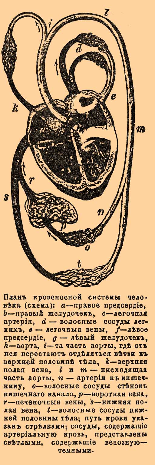 План кровеносной системы человека (схема): a — правое предсердие, b — правый желудочек, c — легочная артерия, d — волосные сосуды легких, e — легочные вены, f — левое предсердие, g — левый желудочек, h — аорта, i — та часть аорты, где от нее престают отделяться ветви к верхней половине тела, k — верхняя полая вена, l и m — нисходящая часть аорты, n — артерии к кишечнику, o — волосные сосуды стенок кишечного канала, p — воротная вена, r — печеночные вены, s — нижняя полая вена, t — волосные сосуды нижней половины тела; путь крови указан стрелками; сосуды, содержащие артериальную кровь, представлены светлыми, содержащие венозную — темными.
