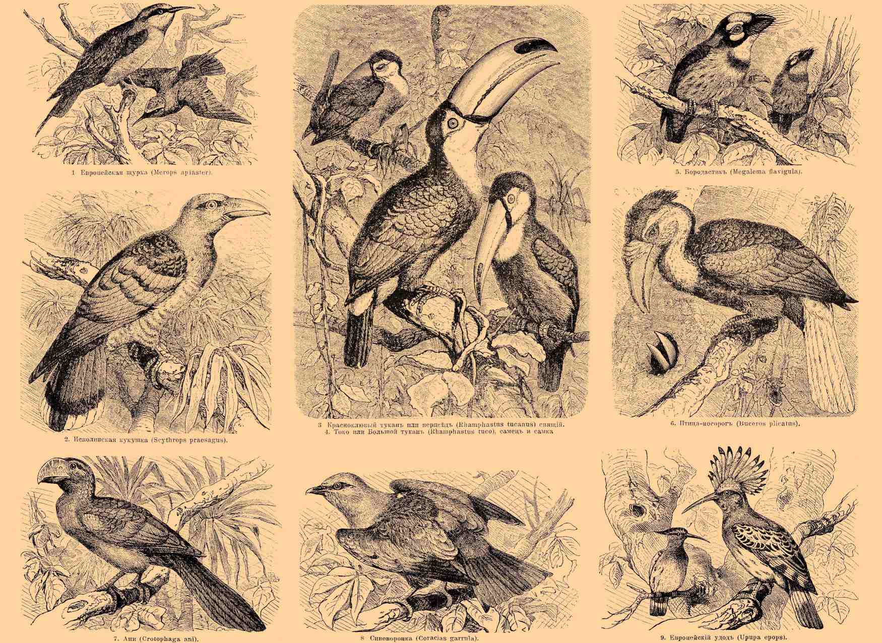 Важнейшие семейства: перцеяды или туканы (Rhamphastidae), например красноклювый перцеяд (Rhamphastus erythrorhynchus s. tucanus, фиг. 3), токо (R. toco s. magnirostris, фиг. 4). Бородатые птицы, бородачи (Coditonidae, описание см. Бородастики), напр. желтозобая мегалема (Megalema flavigula, фиг. 5). Бородатые кукушки или ленивки (Bucconnidae), близкое к предыдущему. Жакамары (Galbulidae). Трогоны (Trogonidae), Кукушки (Cuculidae), напр. ани (Crotophaga ani, фиг. 7), исполинская кукушка (Scythrops Novae Hollandiae, фиг. 2). Бананоеды (Musophagidae). Носороги (Bucerotidae), например джулан (Buceros plicatilis, фиг. 6). Зимородки (Alcedinidae). Щурки (Meropidae), например золотистая щурка (Merops apiaster, фиг. 1). Сивоворонки (Coraciadae), напр. сивоворонка (Coracias garulla, фиг. 8). Удоды (Upupiadae), например удод (Upupa epops, фиг. 9).