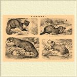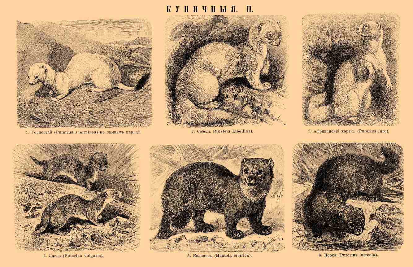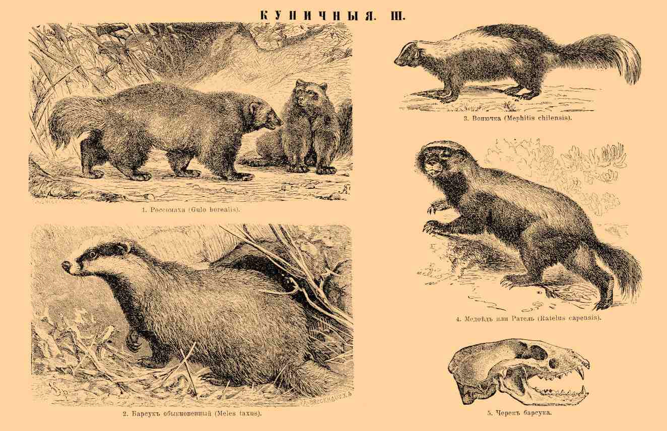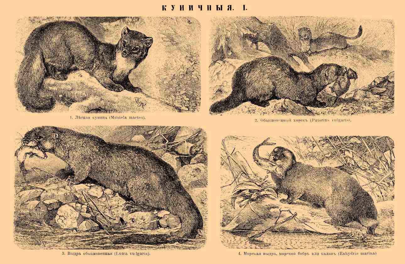 К. подразделяются на три подсемейства: 1) К. (Mustelina или Martina) по большей части пальцеходящие с длинным тонким телом на очень низких ногах с небольшим коротким поперечно-удлиненным бугорчатым зубом; важнейшие роды: куница (Mustela), из представителей которого на табл. изображены лесная куница (Mustela martes) и соболь (Mustela zibellina); род хорек (Putorius), из представителей которого на табл. обыкновенный хорек (Р. foetidus), норка (Р. lutreola), горностай (Р. erminea), африканский хорек (Р . furo), ласка (Р. vulgaris), колонок (Р. sibiricus) и росомаха (Gulo), из которого изображена обыкновенная росомаха (Gulo borealis). 2) Выдровые (Lutrina), y которых пальцы соединены плавательной перепонкой, хвост плоский, заостренный, верхний бугорчатый зуб большой квадратный. Сюда относятся род выдра (Lutra), напр. обыкновенная выдра (L. vulgaris) и род морская выдра (Enhydris), именно морская выдра, морской или камчатский бобр или калан (E. marina). 3) Барсуковые (Melina), стопоходящие с толстым плотным телом, очень большим верхним бугорчатым зубом и длинными тупыми когтями, приспособленными для рытья. Важнейшие роды: барсук (Meles), напр. обыкновенный барсук (M. taxus), вонючка (Меphitis), напр. M. chilensis, медоед или рашель (Mellivora s. Ratelus), напр. R. cap e nsis, и вонючий барсук или короткохвост (Муdaus), например теладу (M. meliceps).