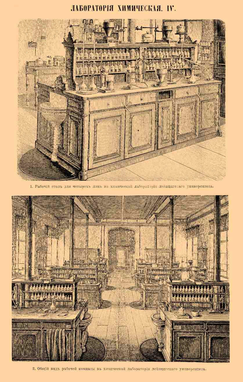 1. Рабочий стол для четырех лиц в химической лаборатории лейпцигского университета. 2. Общий вид рабочей комнаты в химической лаборатории лейпцигского университета.