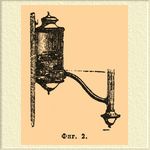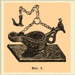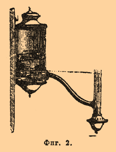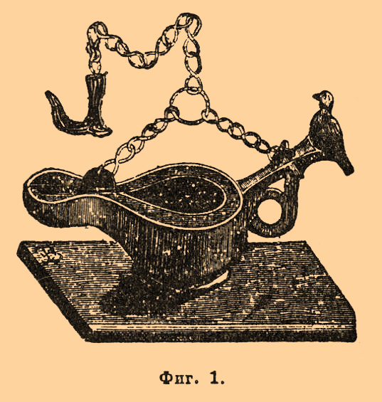 Это был глиняный, плоский, овальный сосуд, наполненный маслом, куда погружалась шерстяная светильня, свободный конец которой выдавался наружу на краю узкой части сосуда. Этого рода Л. даже менее совершенны, чем обыкновенные масляные Л. или так называемые ночники, употребляемые еще и в наше время. Они давали копоть и распространяли более тяжелый запах, чем нынешние ночники, так как употреблявшееся для них масло было хуже очищено. Единственными приборами, служившими для регулирования горения этих Л. служили шпильки, щипцы, которыми снимался нагар и приподнимался из резервуара Л. свободный конец светильни. Этого рода масляные Л., однако, не встречали себе соперниц до конца ХП столетия, когда в Англии была изобретена сальная свеча. Существенное усовершенствование самих Л. произошло лишь в конце XVIII стол., когда Аргандом (см.) была изобретена Л. (Argand), фиг. 2. Копоть и незначительный свет прежних масляных ламп происходили от недостаточного доступа воздуха и неполного, вследствие этого, сгорания углерода. Арган придал светильне форму цилиндрической трубки, так что воздух поступал в пламяиз средины светильни. Пламя такой Л. имело вид тонкого цилиндра, омываемого с обеих сторон воздухом. Резервуар с маслом помещался (фиг. 2) на известном расстоянии от горелки и несколько выше ее, так что масло подымалось до верхнего конца светильни. Л. вешалась на стене или устанавливалась на канделябре.