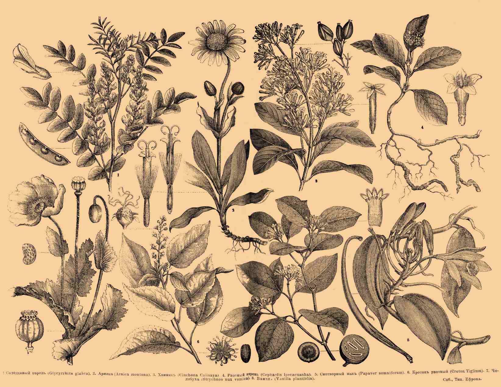 1. Солодковый корень (Glycyrrhiza glabra). 2. Арника (Arnica montana). 3. Хинник (Cinchona Calisaya). 4. Рвотный корень (Cephaelis Ipecacuanha). 5. Снотворный мак (Papaver somniferum). 6. Кротон рвотный (Croton Tiglium). 7. Чилибуха (Strychnos nux vomica). 8. Ваниль (Vanilla planifolia).