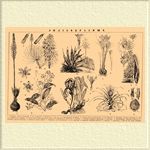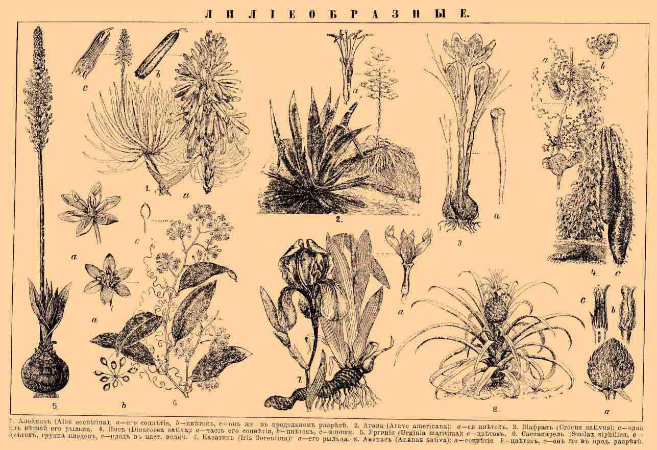 1. Алойник (Aloe socotrina): a — его соцветие, b — цветок, c — он же в продольном разрезе. 2. Агава (Agava americana): a — ее цветок. 3. Шафран (Crocus sativus): a — одна из ветвей его рыльца. 4. Ямс (Dioscorea sativa): a — часть его соцветия, b — цветок, c — шишки. 5. Ургиния (Urginia maritima): a — цветок. 6. Сассапарель (Smilax siphilica): a — цветок, b — группа плодов, c — плод в наст. величину. 7. Касатик (Iris florentina): a — его рыльца. 8. Ананас (Ananas sativa): a — соцветие, b — цветок, c — он же в продольном разрезе.