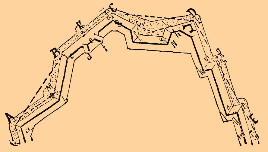 Длина оборонительной линии одного и того же верка определяется дальностью хорошего ружейного или картечного выстрела и в верках ныне принятого расположения (канонирных) достигает 250 саж. (в прежнее время не превосходила 300-400 шагов), длина же оборонительной линии, соединяющей 2 отдельных и независимых, но друг друга поддерживающих верка (напр., два форта), определяется дальностью хорошего шрапнельного выстрела при условии хорошо видеть цель: движущиеся войска (1500 с.). Магистральная Л. определяет очертание верка в плоскости горизонта земли (a1b1c1d1e1g1h1k1m1n1o1p1) . Кордонная Л., или Л. кордона, есть Л. гребня эскарповой стены. Отсюда и камень, чисто тесанный и имеющий отлив, обыкновенно венчающий собою стены, носит название кордонного камня. Л. полигона (AB или CD) — одна из сторон многоугольника полигона, ABCDE..., образуемого крепостным расположением, причем вершинами этого многоугольника служат вершины исходящих углов главной оборонительной ограды. Длина Л. полигона зависит от принятой длины оборонительной Л. и изменяется в пределах от длины одной до длины двух оборонительных Л., смотря по тому, помещается ли батарея, фланкирующая оборонительную Л., на одном из концов Л. полигона или на ее середине. Л. огня (abcdefghkm) — внутренний, или боевой, гребень тех брустверов верка, за которыми непосредственно расположены стрелки или артиллерия. Л. огня совершенно независима от направления Л. оборонительных и полигона и от положения Л. магистральных и кордона и определяется исключительно лишь требованиями обстрела: поэтому она составляет одну из основных Л. очертания верка; на том же основании Л. огня, и только она одна, изображается на фортификационных чертах, для лучшего понимания их, толстой чертой, бросающейся в глаза.