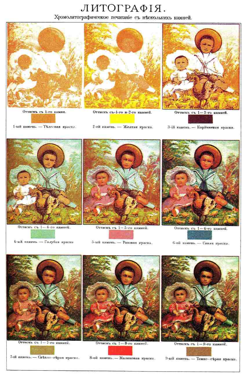 Для хромолитографирования изображенной на ней картинки взято девять камней. По переводе на них контура на первом из них литографированы обыкновенным способом только те части, в которых на оригинале имеется розовато-красный, телесный тон, на втором камне — только желтый тон оригинала, на третьем — только коричневый и т. д. до девятого камня, воспроизводящего темно-серый тон. Печатание производится последовательно со всех камней, так что один и тот же листок эстампной бумаги сначала накладывается на 1-ый камень, на который наведена телесная краска, потом переходит на 2-ой камень и воспринимает от него желтую краску и т. д., пока, наконец, после печатания своего на 9-м камне не превращается в совершенно готовую картинку. Между двумя следующими друг за другом печатаниями должно проходить некоторое время, достаточное для того, чтобы самый оттиск и краска на нем успели высохнуть. Другое условие, необходимое для успешного печатания хромолитографий, состоит в накладке эстампа на разные камни наиточнейшим образом, т. е. так, чтобы контур рисунка в оттиске с одного камня ложился на другой камень черта в черту с имеющимся на нем контуром. Малейшее несоблюдение этого условия производит неприятные пробелы и пятна в колорите эстампа и сильно вредит его полному сходству с оригиналом.