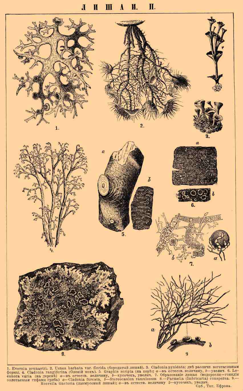 1. Evernia prunastri. 2. Usnea barbata var. florida (бородатый лишай). 3. Cladonia pyxidata; две различные вегетативные формы. 4. Cladonia rangiferina (олений мох). 5. Graphis scripta (на коре): a — в естеств. величину, b — увелич. 6. Lecanora varia (на дереве): a — в естеств. величину, b — кусочек, увелич. 7. Образование лишая (водоросли — гонидии, оплетаемые гифами гриба): a — Cladonia furcata, b — Stereocaulon ramulosum. 8. Parmelia (Imbricaria) conspersa. 9. Rocella tinctoria (лакмусовый лишай): a — в естеств. величину, b — кусочек, увелич.