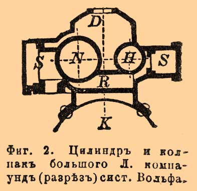 Первая из этих фигур представляет разрез цилиндров и колпака большого Л.-компаунд системы Вольфа. Здесь К — котел, О — колпак, H — цилиндр высокого давления, N — цилиндр низкого давления, К — ресивер, S — золотниковые коробки.