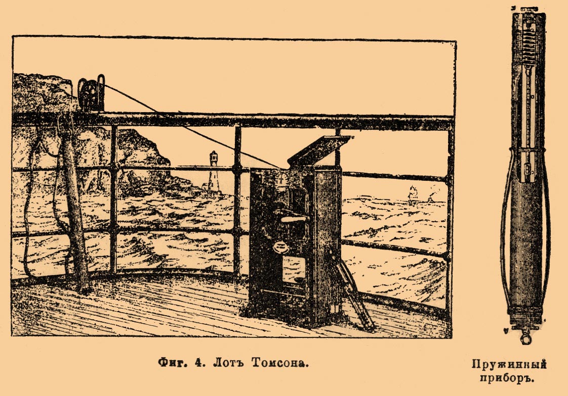 Станок привинчивается к палубе, а проволока пропускается через особый роульс, устанавливаемый на борту судна. Расчет глубины производится не по длине вытравленной проволоки, но по специальным глубиноизмерителям. Глубиноизмеритель Томсона основан на законе Мариотта — объемы газа обратно пропорциональны давлению — и состоит из двухфутовой стеклянной трубки, закрытой с одного конца и внутри покрытой хромовокислым серебром, придающим трубке красный цвет. При погружении трубки открытым концом вниз увеличивающееся давление заставляет проникать воду в трубку, сжимая находящийся внутри воздух. Пусть а длина трубки, h — глубина, b — соответствующая атмосферному давлению высота водяного столба, то высота x, на которую поднимется вода в трубке, получится из уравнения: