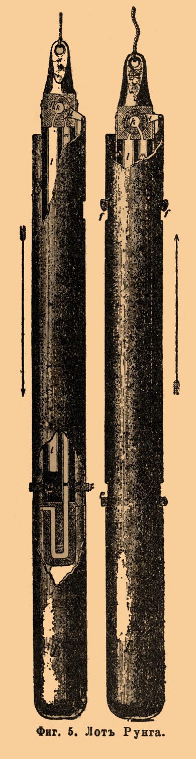 Отсюда можно для каждого x определить h при высоте барометра в 760 мм и удельном весе морской воды 1,0265 b = 10,065 м. Та часть трубки, в которую проникает морская вода, теряет свою внутреннюю красную окраску и становится желтовато-белой; по длине оставшейся красной части определяют, обыкновенно помощью особой масштабной линейки, глубину погружения трубки в морских саженях. При измерении глубин стеклянная трубка вставляется в металлическую гильзу и привязывается к лотлиню на некотором расстоянии от свинцового груза, которым трубка увлекается в глубину. Для каждой промерной точки требуется отдельная трубка, так как раз бывшая в деле трубка более не годится, пока вновь не будет окрашена. Каждый экземпляр Л. Томсона, отпускаемый на суда, обыкновенно снабжается не менее как 100 трубками. Существует также видоизменение описанного глубиноизмерителя, состоящее в том, что одна трубка заменена системой нескольких трубок, и в зависимости от глубины погружения прибора вода переливается из 1-й трубки во 2-ю и т. д.; о глубине погружения судят по высоте остающейся воды в одной из трубок. Наконец, в последнее время стал входить в употребление пружинный глубиноизмеритель. В таком приборе давление воды действует на поршень, преодолевая сопротивление пружины. Минимальный индекс движется вместе с поршнем и указывает на шкале глубину в саженях. Такой прибор вставляется в свинцовую трубу, служащую вместе с тем грузом; в трубе сделаны отверстия для доступа воды к прибору (см. рядом с фиг. 4). Вышеописанными глубиноизмерителями можно определять глубины не более 130-150 саж., так как деления шкалы при таких глубинах становятся уже весьма малыми. Глубиноизмеритель Рунга (фиг. 5), названный им универсальным батометром, дает возможность измерить глубину до 1100 м. саж.