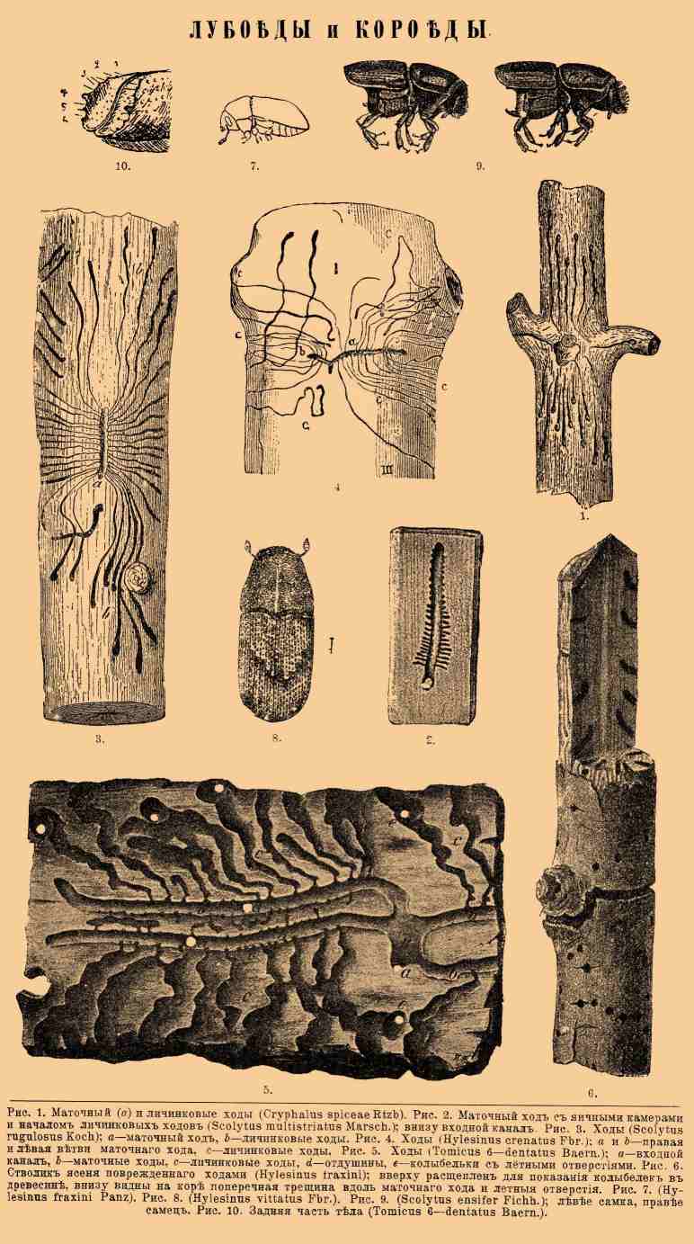 Рис. 1. Маточный (а) и личинковые ходы (Cryphalus spiceae Rtzb.). Рис. 2. Маточный ход с яичными камерами и началом личинковых ходов (Scolytus multistriatus Marsch.), внизу входной канал. Рис. 3. Ходы (Scolytus rugulosus Koch); a — маточный ход, b — личинковые ходы. Рис. 4. Ходы (Hylesinus crenatus Fbr.); a и b — правая и левая ветви маточного хода, c — личинковые ходы. Рис. 5. Ходы (Tomicus 6-dentatus Baern.); a — входной канал, b — маточные ходы, c — личинковые ходы, d — отдушины, e — колыбельки с летными отверстиями. Рис. 6. Стволик ясеня, поврежденного ходами (Hylesinus fraxini); вверху расщеплен для показания колыбелек в древесине, внизу видны на коре поперечная трещина вдоль маточного хода и летные отверстия. Рис. 7. Hylesinus fraxini Panz. Рис. 8. Hylesinus vittatus Fbr. Рис. 9. Scolytos ensifer Fichh.; левее самка, правее самец. Рис. 10. Задняя часть тела (Tomicus 6-dentatus Baern.).