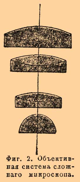 Наиболее существенная часть микроскопа — его объектив. Первые объективы микроскопа состояли из одной — раньше не ахроматической, затем ахроматической чечевицы. Позже объективы начали составлять из нескольких расположенных друг над другом отдельных чечевиц; это представляло то преимущество, что: несмотря на общее короткое фокусное расстояние объектива, отдельные чечевицы его могли иметь не слишком малый радиус кривизны; соответственной комбинацией стекол легче избавиться в достаточной степени от аберрации; свинчивая с такого сложного объектива отдельные чечевицы, мы получаем ряд новых, более слабых по увеличению объективов. Последнее, однако, с успехом возможно лишь со сложными объективами, в которых каждая чечевица в отдельности избавлена от аберрации; этого достигнуть, однако, чрезвычайно трудно, и посему ныне при сильных увеличениях для каждого увеличения изготовляют отдельный сложный объектив, который никогда не развинчивается и успешно действовать может лишь как целое. Для уничтожения сферической и хроматической аберрации в объективах прибегают к различным средствам; чаще всего (по Амичи) в нижних стеклах объектива нарочно накопляют аберрационные ошибки, придавая чечевицам большую выпуклость, даже полушаровую форму, чтобы затем легче было соответственной комбинацией верхних чечевиц с обратными по знаку аберрационными ошибками совершенно избавиться от аберрации; фиг. 2 представляет сечение такой простейшей объективной системы.
