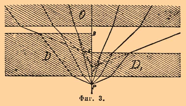 При расчете и конструкции объективов приходится еще принимать во внимание одно обстоятельство — а именно влияние покровного стеклышка (см. ниже), под которым располагают обыкновенно наблюдаемые предметы. Это стеклышко преломляет лучи, исходящие из наблюдаемого предмета P так (фиг. 3, где D — покровное стеклышко O — объектив), что они по продолжении не сходятся в одной точке, и эта разница в схождении различных лучей тем больше, чем больше толщина покровного стекла изображения (фиг. 3; два стекла: более толстое D и более тонкое D1). [Это несхождение лучей изображено на фиг. 3 в значительно увеличенном масштабе.]