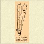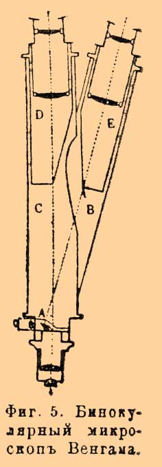 Окулярами у М. служат почти исключительно окуляры Гюйгенса (Кампани), реже окуляры Рамсдена. Последние применяются главным образом тогда, когда необходимо получить действительное изображение от объектива ниже окуляра, например при измерениях изображения с помощью окулярных микрометров (см. Окуляр, Микрометр). В последнее время некоторые оптики (особенно Цейс) начали готовить окуляры М. отлично от обыкновенных; в этих новых типах как объектив, так и соответствующий ему окуляр в отдельности не исправляются относительно аберраций, но их располагают так, чтобы аберрации их компенсировали друг друга и они вместе давали лишенную аберрационных ошибок систему; такие окуляры называются компенсационными. Существует целый ряд приспособлений, располагаемых внутри окуляров и служащих для специальных наблюдений; таковы гониометрические окуляры, дающие возможность измерять углы кристаллов, видимых в М. (см. Гониометр); микрометрические окуляры (Рамсдена), в фокусе которых расположена тонкая стеклянная пластинка с мелкими делениями (1/100 мм) и служащие для измерения величины микроскопических объектов; поляризационные окуляры, дозволяющие наблюдать в поляризованном свете; спектральные окуляры (см. Спектральный анализ), дающие возможность наблюдать спектры поглощения предметов, исследуемых под М. Иногда желательно видеть (прямые, не обращенные) изображения в поле зрения М.; тогда прибегают к обращающим окулярам, в которых простая комбинация призм поворачивает изображение и делает его из обращенного прямым [О проекционных окулярах см. Фотография (научная).]. В Англии пользуются также часто стереоскопическими окулярами, в которых с помощью призм пучок лучей, идущих от объектива, разделяется на две части и направляется в два отдельных окуляра, приспособленные к бинокулярному рельефному зрению. Иногда раздваивающую пучок призму помещают у самого объектива; такой простейший бинокулярный М. Венгама изображен на фиг. 5.