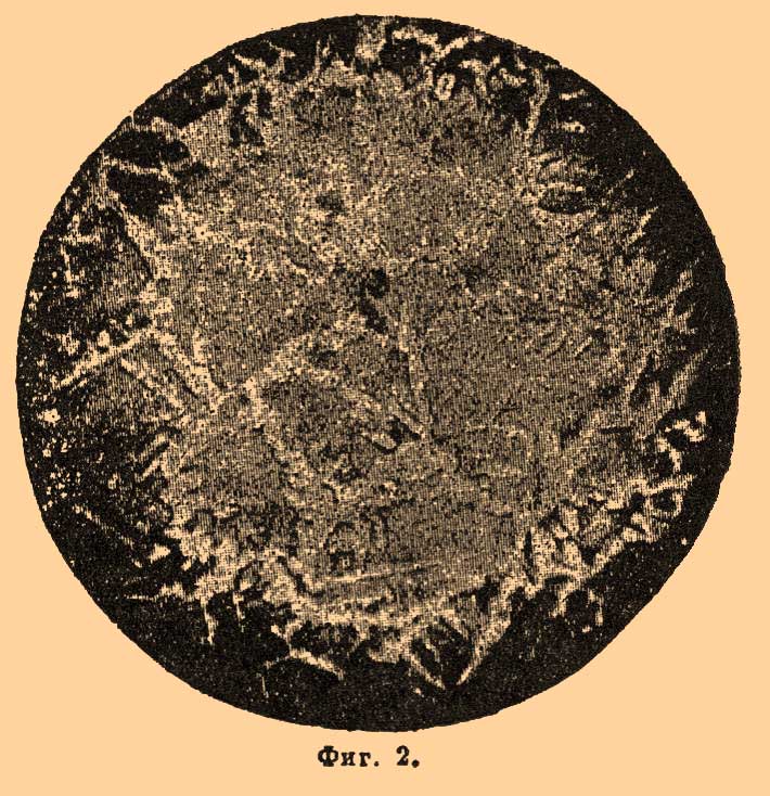 — Всякий металл (простое тело или металлический сплав) механически не представляет собой вполне однородного тела. Структура твердого тела зависит от условий его образования. Разные посторонние влияния причиняют некоторого рода беспорядок элементов кристаллического сложения. Главными факторами в этом отношении оказываются: условия, при которых застывало тело, температура нагрева, способ охлаждения и, наконец, механическая обработка. В свою очередь, неоднородность структуры вызывает междучастичные напряжения, которые изменяют механические свойства металла в различных частях его поперечного сечения. Для исследования данного металла недостаточно знать его химический состав и результаты механических испытаний, но необходимо еще изучить его частичное сложение. Исследования структуры металлов составили новую отрасль науки, известную под названием металлография, которая пока ограничивается главным образом исследованием структуры железных продуктов. Для такого исследования в последнее время применили микроскоп; фотографии удалось воспроизвести микроскопические изображения, которые наглядно представляют строение металла в увеличенном виде. Первые работы в этом отношении были сделаны английским металлургом Сорби, который в 1864 г. представил микрофотографические снимки изломов и шлифов различных сортов стали. Потом в 1878 г. в Германии профессор Мартенс опубликовал свои микроскопические исследования железа и стали. Во Франции, в 1880 г., Барба ввел микроскоп на заводе Крезо и, так сказать, дал первый толчок трудам Осмонда и Берта. В России профессор Д. К. Чернов на основании своих микроскопических исследований опубликовал в 1880 г. теорию структуры литой стали. Микроскопия стали в настоящее время сделала большие успехи и в Америке. Благодаря трудам главным образом Осмонда, в настоящее время микроскопический анализ можно признать способом научного исследования стали, и им пользуются уже с большим успехом на многих стальных заводах для контроля производства. Для исследования изломов стали обыкновенно довольствуются хорошей лупой, для применения же микроскопа необходимо иметь совершенно гладкую поверхность испытуемого образца. Это достигается полировкой и травлением поверхности образца в кислоте. Из желаемого места вырезают резцом или пилой небольшой кусок стали, поверхность которого не превышает 1 кв. стм. Эту поверхность очищают напилком и шлифуют на мелкой наждачной бумаге, пока не получится гладкая и ровная плоскость. Оставшиеся штрихи и царапинки выводят трением поверхности образца на стеклянной или чугунной плитке по мелкому наждаку, смоченному водой. Затем выглаживают поверхность притиранием с венской известью или просеянным английским крокусом (или прямо тончайшим наждаком), смоченным тоже водой, и наконец окончательная полировка совершается уже на стеклянной или дубовой пластине, обтянутой замшей, полотном или пергаментом и покрытой смоченным крокусом. Маленький образчик, один или несколько, прикрепляют канадским бальзамом к стеклянной или к металлической пластинке и полируют как указано выше. В некоторых случаях, а именно при полировке хорошо отожженной или прямо литой стали, сложение ее так различается по твердости, что более мягкие части, стираясь легче, образуют углубления, более же твердые ос