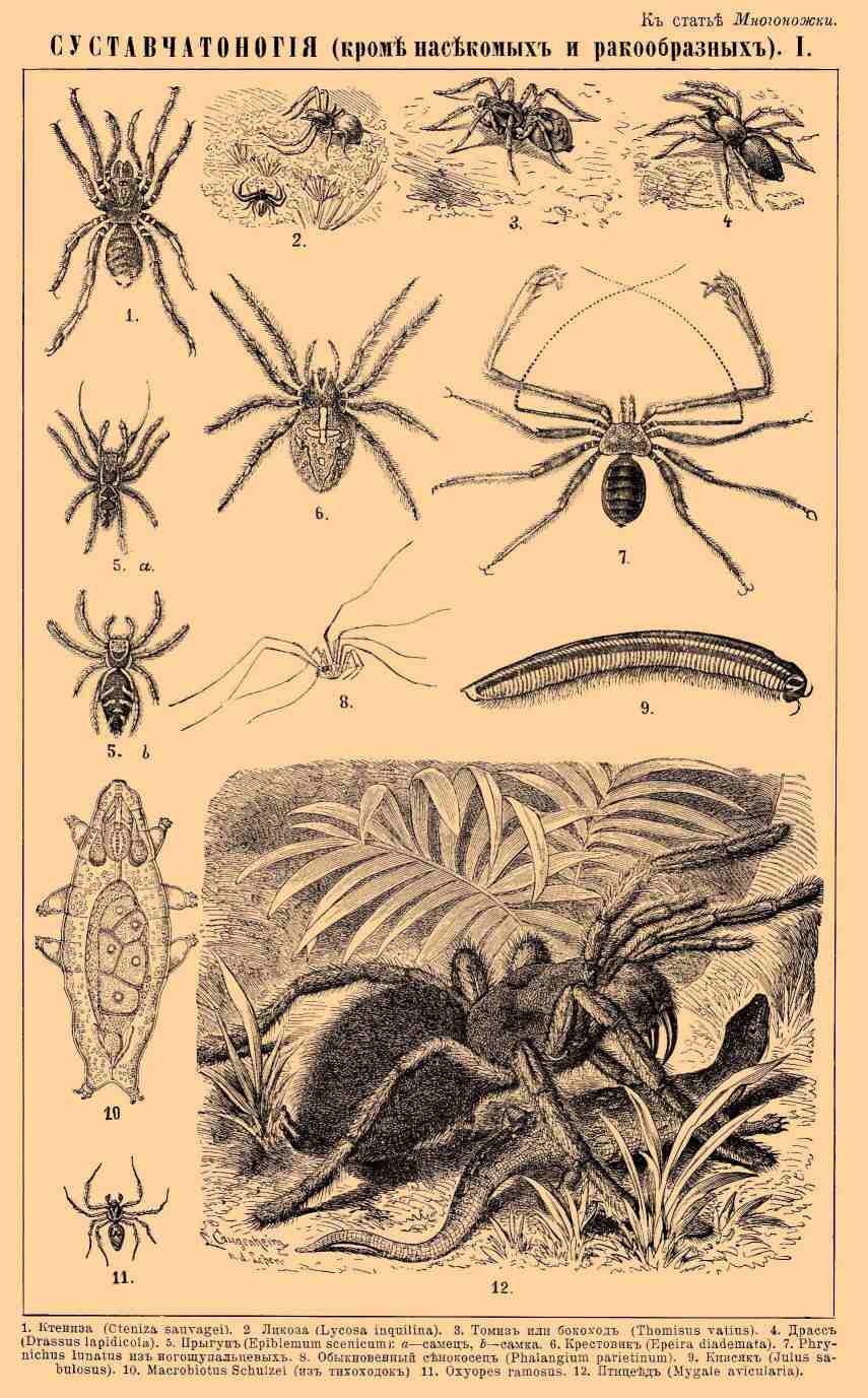 СУСТАВЧАТОНОГИЕ (кроме насекомых и ракообразных). I. 1. Ктениза (Cteniza sauvagei). 2. Ликоза (Lycosa inquilina). 3. Томиз, или бокоход (Thomisus vatius). 4. Драсс (Drassus lapidicola). 5. Прыгун (Epiblemum scenicum): a — самец, b — самка. 6. Крестовик (Epeira diademata). 7. Phrynichus lunatus из ногощупальцевых. 8. Обыкновенный сенокосец (Phalangium parietinum). 9. Кивсяк (Julus sabulosus). 10. Macrobiotus Schulzei (из тихоходок). 11. Oxyopes ramosus. 12. Птицеед (Mygale avicularia).