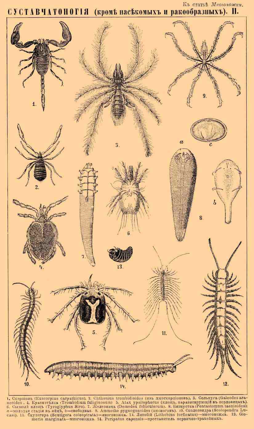 СУСТАВЧАТОНОГИЕ (кроме насекомых и ракообразных). II. 1. Скорпион (Euscorpius carpathicus). 2. Chthonius trombidioides (из лжескорпионов). 3. Сольпуга (Galeodes araneoides). 4. Краснотелка (Trombidium fuliginosum). 5. Atax ypsilophorus (клещ, паразитирующий в перловицах). 6. Сырный клещ (Tyroglyphus Siro). 7. Железница (Demodex folliculorum). 8. Пятиустка (Pentastomum tae nioides): a — молодая стадия в яйце, b — свободная. 9. Ammothe pygnogonoides (пикногон). 10. Сколопендра (Scolopendra Lucasi). 11. Скутигера (Scutigera coleoptrata) — многоножка. 12. Литобий (Lithobius forficatus) — многоножка. 13. Glomeris marginata — многоножка. 14. Peripatus capensis — представитель первичнотрахейных.
