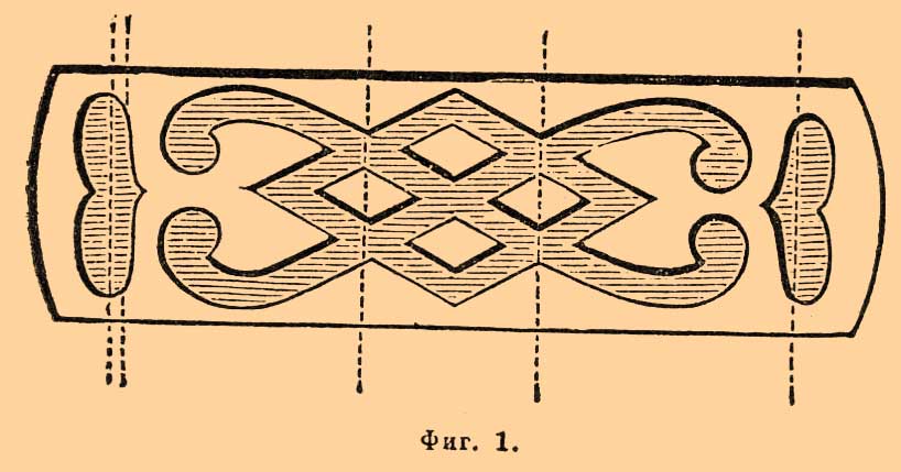 М. (техн. см. Стеклянное производство и др.). — Деревянно-мозаичные изделия привозятся в Россию преимущественно из-за границы. Впрочем, в России тоже изготовляются изделия этого рода, и они в некоторых местностях составляют даже предмет кустарного производства. Так, с 1884 г. в с. Маклакове Васильсурского у. Нижегородской губ. стало распространяться производство деревянно-мозаичных изделий — столиков, шкатулок и пр. В настоящее время этим промыслом занимается почти все упомянутое село, причем мастерство в этих изделиях достигло высокой степени совершенства. Большинство кустарей села Маклакова употребляет для своих работ искусственно окрашенную в различные цвета древесину, и лишь человек 10 работает натуральными цветными деревами, пользуясь для этого преимущественно ящиками из-под привозимых из-за границы товаров (сигар, красок, москателей и т. п.). Тонкие дощечки или фанерки всех тех цветов, которые требуются по рисунку, подвергаются обработке при посредстве самых тонких пилок. Когда мозаичный рисунок состоит из одних только прямолинейных фигур, то отдельные кусочки М. можно нарезать острым ножом по железной линейке; криволинейные же фигуры должны быть непременно выпилены. Для приготовления шахматной доски на 4-угольную доску из простого дерева толщиною от 1/2 до 3/4 дм., хорошо выверенную и выстроганную, накладывают рисунок шахматной доски. Затем берут две выстроганных с одной стороны фанерки: одну черного дерева, другую белую (пальма, клен, акация и др.) в 12 дм. длины и режут ножом полосами в 1 1/2 дм. ширины. Отрезав 4 светлых и 4 темных полосы, наклеивают их попеременно на листе белой бумаги и кладут под пресс, пока клей совершенно не просохнет. Тогда снова разрезывают склеенные полосы по направлению, перпендикулярному склейке полосы, тоже в 1 1/2 дм. ширины. Получатся полосы, на которых чередуется темное поле с белым. Эти полосы снова накладывают на лист бумаги и передвигают их так, чтобы и по другому направлению черный цвет чередовался с белым. Остается затем вырезать из фанерки узкую кайму и пригнать ее вокруг шахматного поля. Простой рисунок, состоящий из криволинейных фигур, изображен на фиг. 1 (накладка на платяную щетку).