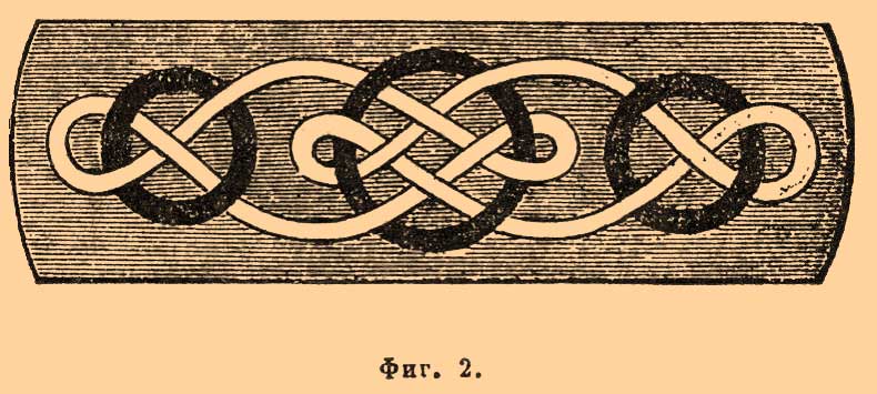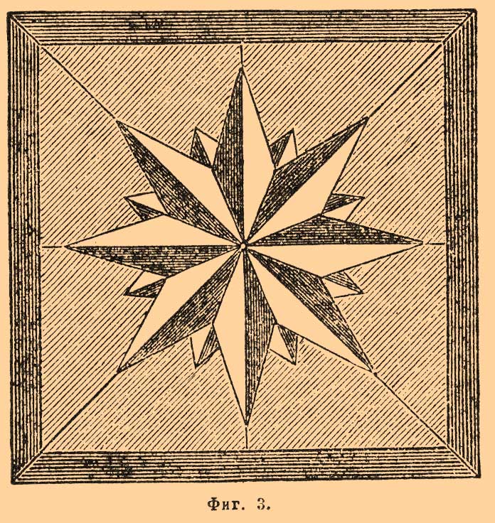 Берутся по пластинке палисандрового дерева, орехового, красного и клена, складываются вместе, склеиваются полосками бумаги и затем выпиливается узор. Основные пластинки располагают на столе в порядке №№ 1, 2, 3 и 4, в них вкладывают продольные полоски из № 2, 3, 4 и 1, кольцеобразные из №№ 3, 4, 1 и 2 и внутренние частички из №№ 4, 1, 2 и 3. В пластинке палисандрового дерева будут, таким образом, продольные полоски из орехового дерева, кольцеобразные из красного дерева и внутренние куски из клена. Фиг. 3 представляет крышку к ящику; звезда составляется обыкновенно из черного и белого дерева.