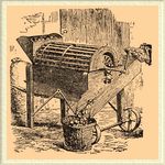 У одного конца цилиндра находится ковш для приема картофеля и корнеплодов, а у другого рукоятка. При вращении последней засыпанный материал перемывается водою и при помощи архимедова винта выбрасывается из цилиндра на наклонную решетку, по которой затем скатывается в подставленный сосуд. Для работы необходимы два человека: один подносит корнеплоды, другой вращает рукоятку. Часовая производительность М. около 45 пд.