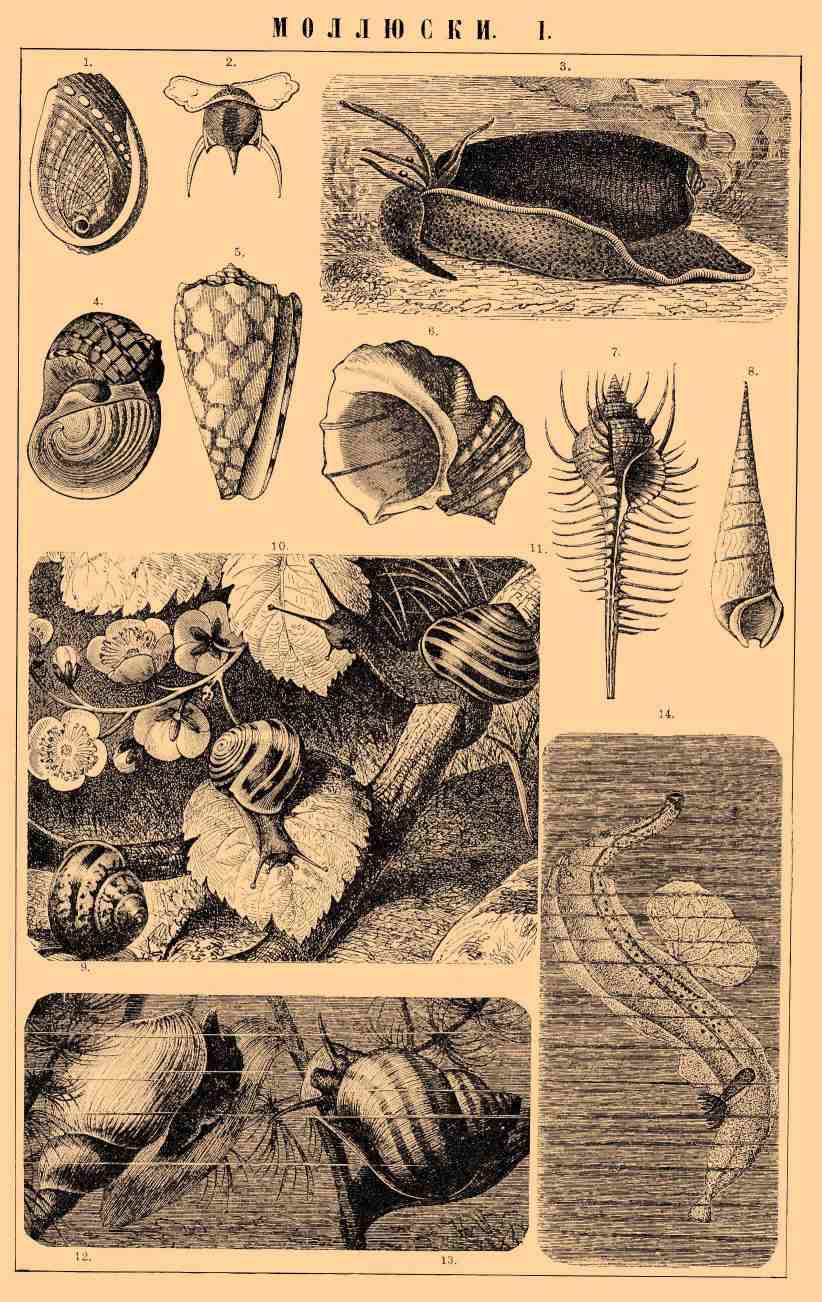 1) Морское ушко (Haliotis tuberculata), раковина снизу. 2) Гиалея, морская бабочка (Hyalea tridentata), сверху. 3) Олива (Oliva maura), сбоку. 4) Натика (Natica canrena), раковина снизу. 5) Конус мраморный (Conus marmoreus), раковина снизу. 6) Turbo marmoratus, раковина снизу. 7) Murex tenuispina, раковина снизу. 8) Faunus ater, раковина снизу. 9) Улитка (Helix arbustorum), сверху. 10) Улитка (Helix hortensis). 11) Улитка (Helix nemoralis). 12) Прудовик (Limnaea stagnalis), сверху. 13) Лужанка живородящая (Paludina vivipara), сверху. 14) Птеротрахеа (Pterotrachea coronata) в обыкновенном для нее положении, т. е. брюшной стороной кверху.