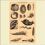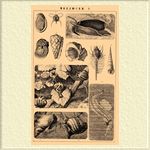 6) Каури (Cypraea moneta), левый экземпляр — снизу, правый — сверку. 7) Катушка (Planorbis corneus), сбоку. 8) Аплизия, или морской заяц (Aplysia depilans), сверху. 9) Ракушка съедобная, мидия (Mytilus edulis); верхний экземпляр сбоку, видны бахромчатые края мантии и биссус; нижний — сверху, со стороны замка. 10) Древоточец (Teredo navalis), сбоку. 11) Морской финик (Lithodomus dactylus), сбоку. 12) Эолида (Aeolis rufibranchialis), сбоку. a — глаз, е — ротовые, с — головные щупальца, d — заднепроходное отверстие, е — половое отверстие, f — спинные придатки, служащие органами дыхания (значительно увеличена). 13) Слизень (Limax agrestis), сверху и справа. 14) Камнеточец (Pholas crispata). сбоку; слева — трубка сифонов, справа выдается нога. Рис. 1, 2, 9, 10, 11 и 14 — пластинчатожаберные моллюски (Lamell i branchiata); рис. 3, 6, 7, 8, 12 и 13 — брюхоногие (Gastropoda), из них 3 и 6 — переднежаберные (Prosobranchiata), 7 и 13 — легочные (Pulmonata), 8 и 12 — зaднeжaбepныe (Opisthobranchiata); pиc. 4 — Amphineura; рис. 5 — лопатоногие (Scaphopoda).