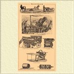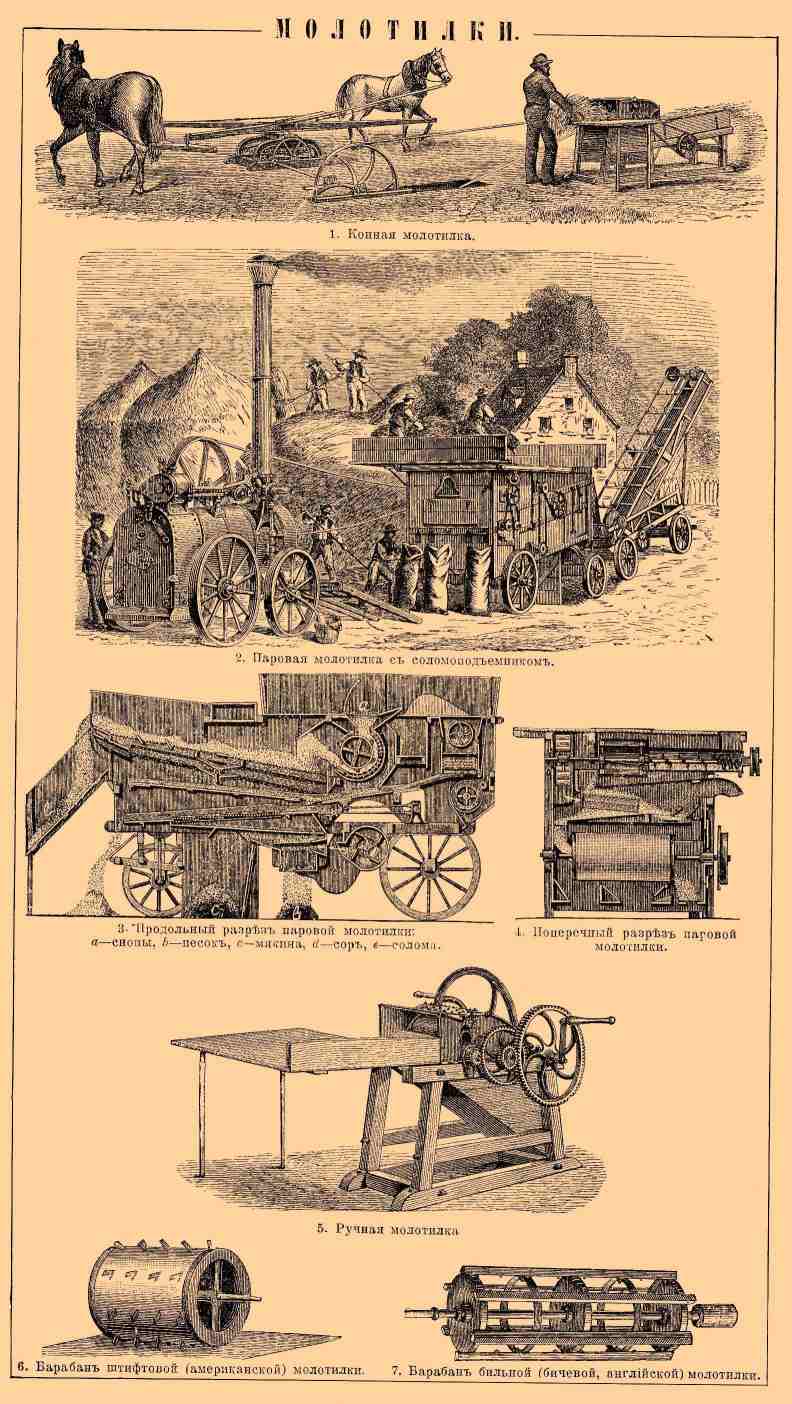 МОЛОТИЛКИ. 1. Конная молотилка. 2. Паровая молотилка с соломоподъемником. 3. Продольный разрез паровой молотилки: a — снопы, b — песок, c — мякина, d — сор, e — солома. 4. Поперечный разрез паровой молотилки. 5. Ручная молотилка. 6. Барабан штифтовой (американской) молотилки. 7. Барабан бильной (бичевой, английской) молотилки.