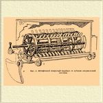 М., где барабан и подбарабанник усажены по спиральной линии зубьями так, что при вращении барабана зубья последнего проходят между зубьями подбарабанника и притом настолько близко, что попадающиеся между ними колосья обшмыгиваются. При классификации М. главное внимание обращают на барабан, по устройству которого эти М. делятся на группы: 1) бильные, 2) штифтовые и 3) бильно-зубчатые. Барабан бильной (бичевой) системы (ф. 7, табл.) состоит из нескольких чугунных кругов, насаженных наглухо на вал, лежащий своими концами в особых подшипниках, привернутых к боковым стенкам стана машины. На поверхности этих кругов, на известном равном друг от друга расстоянии укреплены параллельно оси барабана длинные металлические полосы, или била. Форма и число их чрезвычайно различны; о поперечном разрезе бил и до сих пор еще не согласились. Употребляются и чугунные бруски, так что напоминает собой тоже решетку; форма этих планок и материал, на них употребляемый, бывают различны. Самое простое по устройству и по сборке частей, составляющих подбарабанье, и по легкости приготовления — чугунное. Но приготовленные из чугуна части подвержены в морозное время частым поломкам, а при молотьбе сыроватого хлеба — засорению мякиной. В М. лучших заводов подбарабанье изготовляют только в виде решеток. Не менее важным обстоятельством является тот или другой способ прикрепления этой части машины. Необходимо приспособление, позволяющее видоизменять положение подбарабанника возможно простым способом, чтобы не прерывать надолго работу, что и достигается применением эксцентриков. Определение величины обхватывания (1/3 — 3/5) подбарабаньем барабана, выводится из формы планок, составляющих подбарабанье, формы бил и скорости вращения барабана. При коротких подбарабанниках (относительно окружности барабана) большую роль играет сила, с которой ударяются колосья о подбарабанье, тогда как в длинных — трение, т. е. вытирание зерна из оболочек. Барабан может быть различной длины, так что снопы подкладываются параллельно или перпендикулярно его оси. В первом случае мы имеем так наз. широкие, или продольные, М., во втором — длинные, или поперечные. Выгода при употреблении этих систем М. на стороне широких, в которых полезное действие при достаточной силе двигателя пропорционально ширине барабана да и солома, выходящая из них, не так измята и поломана. Барабан штифтовых (американских) М. делается открытым, и тогда зубья (штифты) прикреплены непосредственно к деревянным брускам, а эти последние к чугунным кругам (фиг. 5), или закрытым, иначе — глухим.