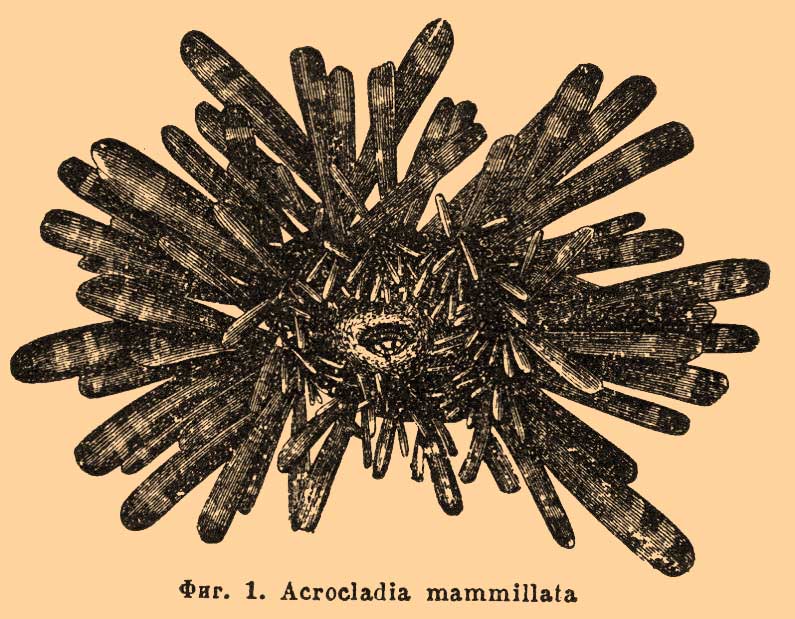 Фиг. 4. Жевательный аппарат (Аристотелев фонарь) М. ежа Toxopneustes lividus сбоку: k — челюсти, z — зубы, m — места прикрепления мускулов, b — известковые части при основании челюстей.