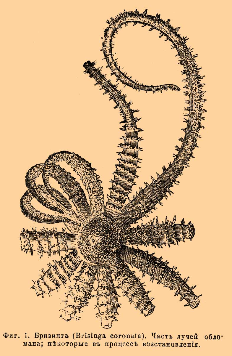 Фиг. 1. Бризинга (Brisinga coronata). Часть лучей обломана, некоторые в процессе восстановления.