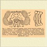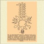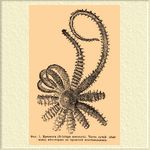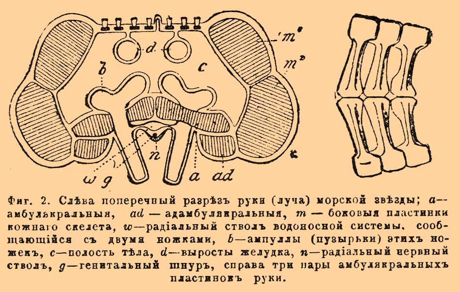 Фиг. 2. Слева поперечный разрез руки (луча) морской звезды: a — амбулякральные, ad — адамбулякральные, m — боковые пластинки кожного скелета, w — радиальный ствол водоносной системы, сообщающийся с двумя ножками, b — ампуллы (пузырьки) этих ножек, c — полость тела, d — выросты желудка, n — радиальный нервный ствол, g — генитальный шнур, справа три пары амбулякральных пластинок руки.