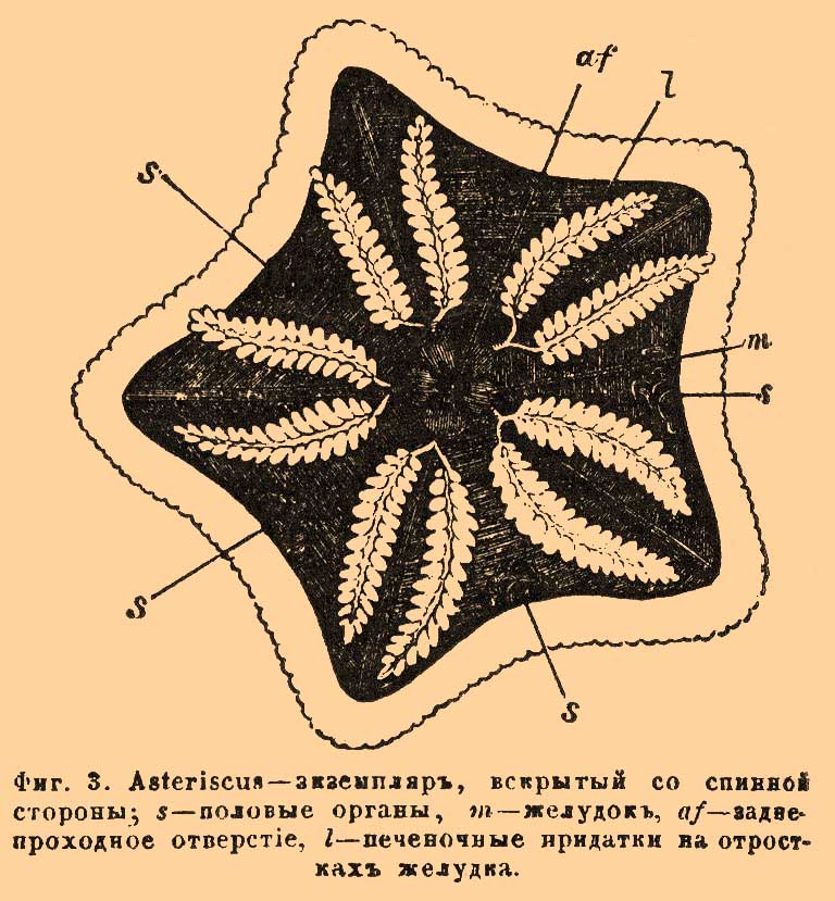 Фиг. 3. Astericus — экземпляр, вскрытый со спинной стороны; s — половые органы, m — желудок, af — заднепроходное отверстие, l — печеночные придатки на отростках желудка.