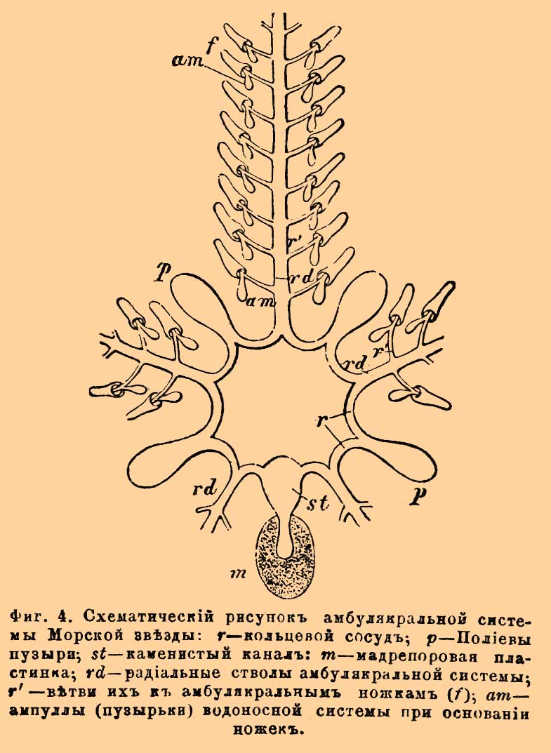 Фиг. 4. Схематический рисунок амбулякральной системы морской звезды: r — кольцевой сосуд, p — Полиевы пузыри, st — каменистый канал, m — мадрепоровая пластинка, rd — радиальные стволы амбулякральной системы, r' — ветви их к амбулякральным ножкам (f), am — ампуллы (пузырьки) водоносной системы при основании ножек.