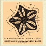У многих М. звезд число лучей больше 5: от 6 (напр. у Luidia) до 40 (у Heliaster), но разветвлений лучей не наблюдается никогда. В коже М. звезд находят, как и у других иглокожих, многочисленные известковые отложения в виде пластинок, палочек и т. п. Главную, более сильно развитую часть скелета составляют пластинки, лежащие на нижней стороне, по бокам лучей и средней части тела. На дне амбулякральной бороздки находятся 2 ряда парных амбулякральных пластинок, между которыми проходят ветви амбулякральной системы к ножкам, и кнаружи от них по ряду адамбулякральных пластинок, а по бокам луча часто по 1—2 ряда краевых. Амбулякральные пластинки каждой пары подвижно соединены между собою, и благодаря этому амбулякральная бороздка под влиянием мускулов может становиться то уже и глубже, то шире и площе. Часть скелета нижней стороны, прилегающая ко рту, составляет рамку его, несущую особые выросты-зубы. Верхняя сторона тела и лучей покрыта по большей части более мелкими известковыми образованиями. У некоторых (например Zoroaster) середину верхней стороны тела занимает система из одной центральной и 2 или 3 кружков пластинок; пластинки эти у других М. звезд во взрослом состоянии не различимы, но могут быть явственны во время образования звзды в личинке. Пластинки эти вместе с непарными (конечными, терминальными) пластинками на концах лучей представляют скелетные образования, общие (хотя не всегда различимые) М. звездам, М. ежам, офиурам и М. лилиям. Ножки сидят в каждой бороздке в 2, реже (у семейства Asleridae) в 4 ряда; по большей части они снабжены на конце с присосками; на конце луча находится придаток амбулякральной системы без присоска — краевое щупальце: здесь же лежит по группе скученных глазных пятен с преломляющими тельцами. Как на нижней, так и на верхней стороне разбросаны различной формы педицеллярии с 2 или 3 подвижными конечными члениками. Кроме того, на коже спинной стороны выдвигаются особые мешочки — кожные жабры. Ротовое отверстие ведет в желудок в виде 5-угольного или многоугольного мешка с 5 или многими (по числу лучей) парами боковых выростов, лежащих в полости лучей и усаженных печеночными придатками (см. фиг. 2 и 3); кишка, иногда снабженная выростками, направляется кверху и оканчивается заднепроходным отверстием в середине верхней стороны или слепо.
