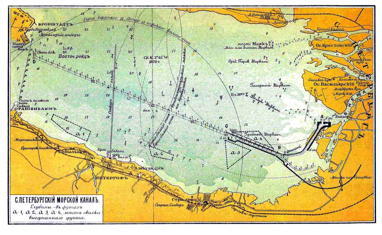 Из этих данных, между прочим, видно, что СПб. М. канал занимает первое место по площади профиля. М. каналы вследствие естественных условий их быта подвергаются обыкновенно в большей или меньшей степени засорению наносным песком. Поэтому для поддержания в них постоянной судоходной глубины необходимо удалять эти наносы, для чего стараются располагать эти каналы таким образом, чтобы наносы вымывались собственною силою течения. Но это возможно лишь при редких условиях и особенно благоприятном расположении порта относительно господствующих течений. Поэтому почти всегда приходится прибегать к извлечению наносов при помощи землечерпательных машин (см. Землечерпание). Извлекаемым грунтом пользуются для возвышения низменных частей портовой территории, или его вываливают на сторону в таких мелких частях моря, где он не может служить материалом для обратного засорения канала (на плане СПб. М. канала части а 1 а 2 а 3 а 4, назначенные местами свалки грунта, обведены пунктирными линиями). Зимою судоходный путь замерзающих каналов поддерживается по возможности ледоколами (см. Ледокольные работы).