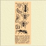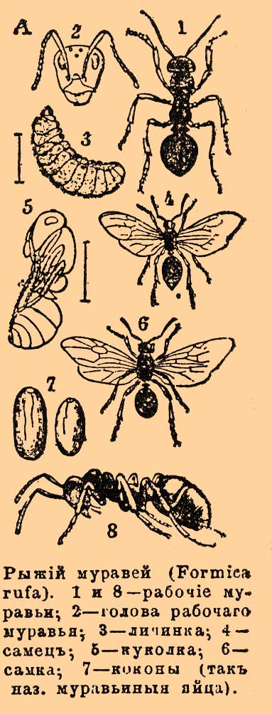 Рыжий муравей (Foormica rufa). 1 и 8 — рабочие муравьи; 2 — голова рабочего муравья; 3 — личинка; 4 — самец; 5 — куколка; 6 — самка; 7 — коконы (так называемые муравьиные яйца).