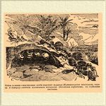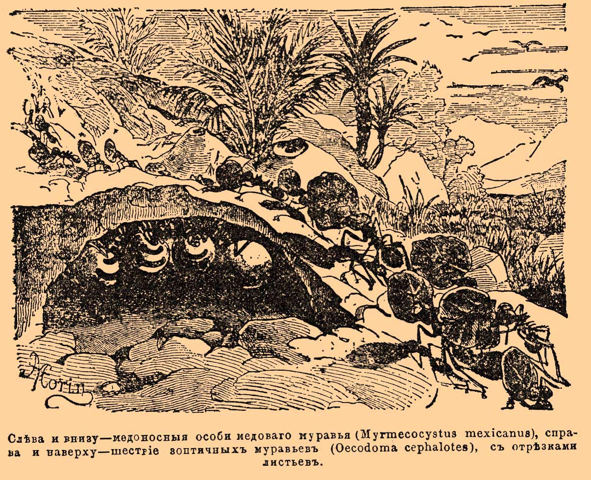 Мы говорили уже о войнах М. Нападения совершаются при этом у разных видов различно. Так, Formica rufa нападает большими массами, Formica sanguinеа менее значительными отрядами, a Polyergus rufescens, очень сильные и обладающие большими челюстями, нападают в малом числе на массы врагов, напротив, мелкие Lasius стараются одолеть крупного врага, вцепляясь в него по несколько сразу. Весьма любопытны походы за пищей, совершаемые некоторыми тропическими М. Так, бродячий M. (Anomma arcens), водящийся в зап. Африке, бродит массами, состоящими из больших и малых особей, по большей части ночью, прячась днем в траве и кустарниках; если же этим М. приходится переходить днем открытые места, то они строят своды из земли, смоченной слюной. На своем пути они истребляют всевозможных животных, которые не успевают спастись бегством; нередко полчища их забираются в жилища людей, истребляя насекомых и других животных, здесь поселившихся, а равно и домашнюю птицу; людям приходится при этом поспешно оставлять свои жилища. При переходах через узкие канавы и т. п. они, прицепляясь друг к другу, образуют висячие мосты, по которым и перебирается все полчище. Американские эцитоны (Eciton) также предпринимают значительные походы. У некоторых видов большие и малые индивиды отличаются друг от друга и по строению челюстей, что указывает на различную роль в деятельности общины, у других различий этих не наблюдается. Некоторые совершают переходы сравнительно небольшими массами, другие (как Есiton hamatum и drepanophorum) движутся громадными полчищами, истребляющими всевозможных мелких животных, которых встречают. Если попавшийся им на пути человек не уступит им заблаговременно дорогу, то они массами бросаются на него, крепко вцепляются челюстями, так что их нельзя оторвать от тела, не разорвав их, и вонзают жало. Замечательно, что передвижение некоторых видов этих. М. совершается весьма правильно: они идут узкой колонной; по сторонам ее движутся большеголовые особи, которые ничего не несут, между тем как сама колонна состоит из мелких неделимых, нагруженных добычей. Некоторые Eciton совершают свои передвижения в крытых ходах, которые строятся по мере движения полчища. Сладкиe жидкости, составляющие, наряду с животными, как мы видели, пищу М., отчасти добываются ими от некоторых насекомых, и главным образом тлей, или травяных вшей, и родственных им червецов. Замечательно при этом, что М., животные хищные, не только не нападают на тлей, но всячески охраняют их, так что тли играют у них как бы роль домашнего скота. Жидкость, которой питаются М., выделяется тлями из двух трубочек на задней части спины; М. гладит тлю усиками, и она выпускает из трубочек капли жидкости, которые и проглатываются М. Иногда М. просто оставляют тлей на тех растениях, на которых те сидят, ограничиваясь тем, что охраняют их от врагов; нередко они устраивают дороги от муравейника к тлям, иногда крытые. В других случаях они возводят вокруг растения, на котором сидят тли, более или менее значительные постройки, играющие как бы роль хлевов. Нередко они переносят тлей внутрь гнезда, где те и питаются соками корней растений или, как у Lasius fuliginosus и brunneus, живущих в дереве, соками молодой древесины (тля, живущая в их гнездах — Lachnus longirostris). Крайне любопытно, что в своих заботах о тлях М. не ограничиваются взрослыми насекомыми, но простирают их и на яйца. Помимо тлей 