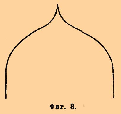 Но византийская полуциркульная арка вскоре заменяется тремя новыми формами, составляющими характерную принадлежность М. архитектуры: стрельчатой аркой (фиг. 1), подковообразной (фиг. 2) и килевидной (фиг. 3).