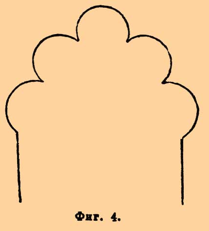 Впоследствии линия арки, в особенности стрельчатой и подковообразной, стала дробиться и представлять совокупность небольших дуг, которые, наконец, превратились как бы в мелкую гофрировку софита (фиг. 4 и 5).