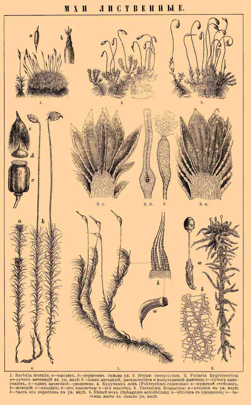 1. Barbula moralis; a — ïëîäèê, b — ïåðèñòîì ñèëüíî óâ. 2. Bryum caeptitosum. 3. Furnaria higrometrica; a — ïó÷îê àíòåðèäèé â óâ. âèäå; b — îäèí àíòåðèäèé, ðàñêðûâøèéñÿ è âûïóñêàþùèé æèâ÷èêè; c — ïó÷îê àðõåãîíèåâ, d — îäèí àðõåãîíèé — óâåëè÷åíî. 4. Êóêóøêèí ëåí (Politrichum commune) a — ìóæñêîé ñòåáåëåê, b — æåíñêèé; c — ïëîäèê; d — åãî êðûøå÷êà; e — åãî øàïî÷êà. 5. Dicranium Scoparium: a — ïëîäèê â óâ. âèäå; b — ÷àñòü åãî ïåðèñòîìà â óâ. âèäå. 6. Áåëûé ìîõ (Sphagnum Acutifolium); a — âåòî÷êà ñ ïëîäèêîì; b — ÷àñòèöà ëèñòà â ñèëüíî óâ. âèäå.