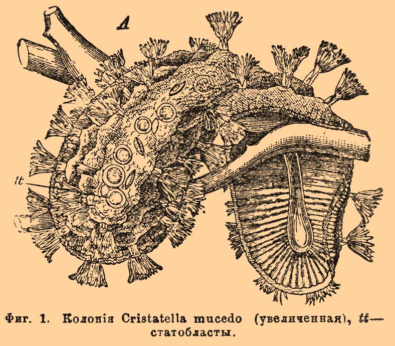Фиг. 1. Колония Cristatella mucedo(увеличенная), tt— статобласты.