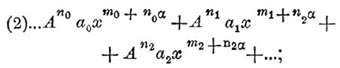 найдутся по крайней мере две, которые будут равны между собой и меньше остальных величин ряда (3). В силу этого принципа задача о нахождении α сводится к тому, чтобы составить всевозможные равенства из величин ряда (3), приравнивая их одну другой, из полученных уравнений определить различные значения α и из этих значений выбрать такие, которые обращали бы соответственные равные величины ряда (3) в наименьшие. Выбранные таким порядком значения и будут наименьшими показателями разложения. Сколько определится наименьших показателей, столько будет и разложений, удовлетворяющих вопросу. Для определения коэффициента А, вставим один из найденных наименьших показателей вместо α в уравнение (2) и приравняем нулю сумму коэффициентов тех членов этого уравнения, которые окажутся содержащими одинаковые степени переменного x. Таким образом получим уравнение, из которого определится А. Найдя α и А, полагаем: